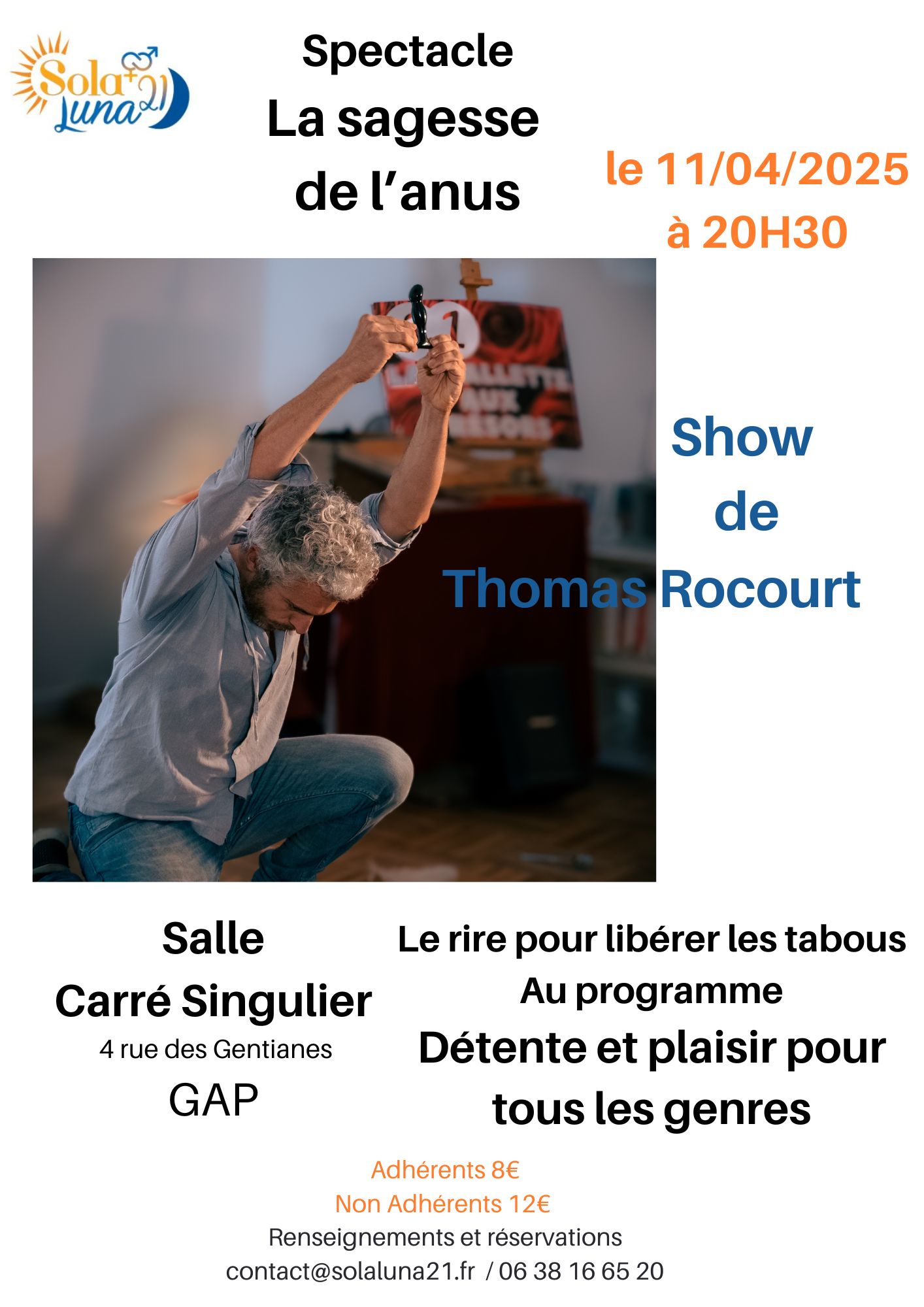 En véritable showman, il nous entraine avec joie dans les méandres du sujet parfois tabou de la sexualité anale, pour rire de nos fausses croyances sur ce sujet, partager des informations sur nos corps que nous ignorons trop souvent.